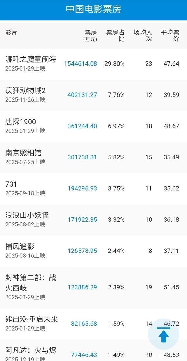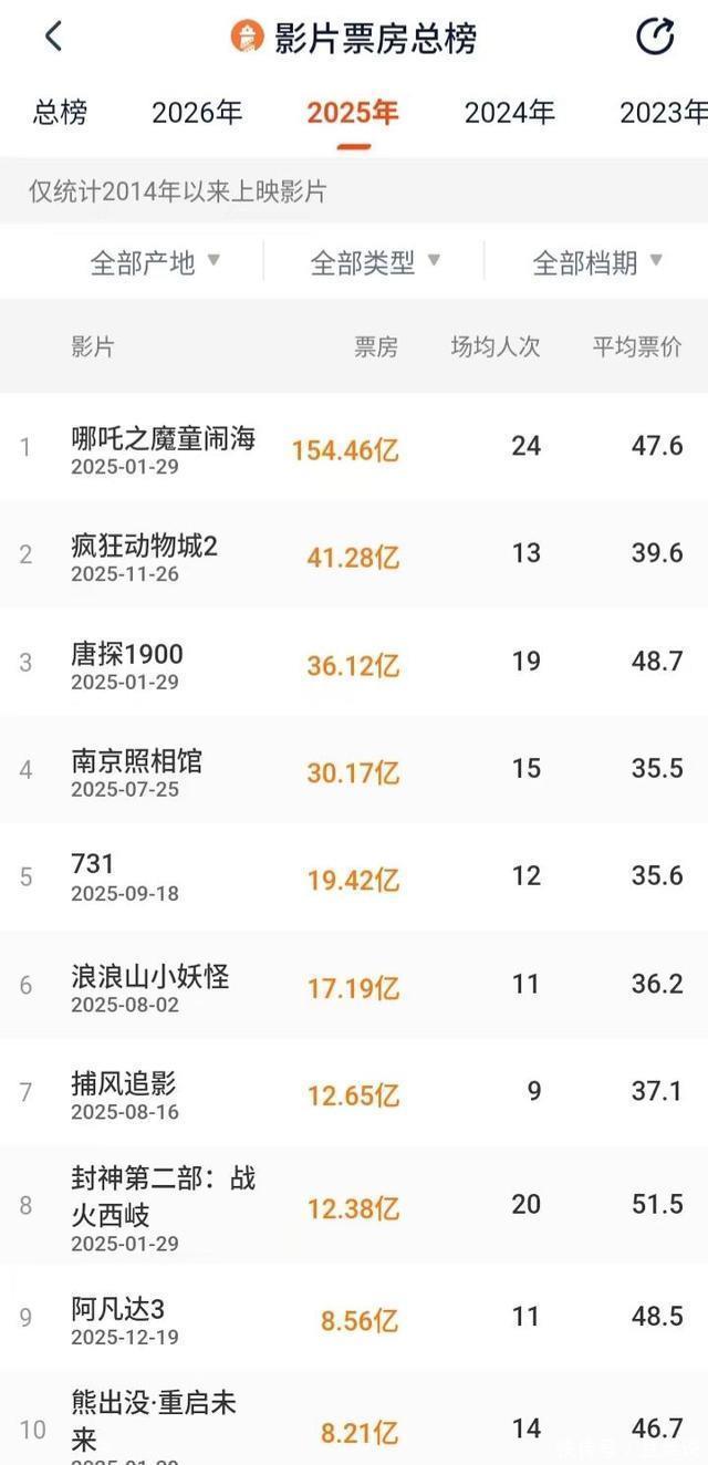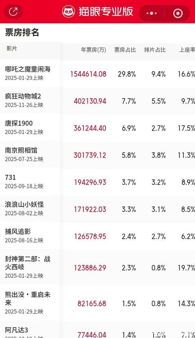 三大数据源露出的十大影片排序不竣工一致,二吞并异: 中国电影票房、猫眼疏导,灯塔相异。十大影片自己疏导,仅仅排序上不同。中国电影票房、猫眼疏导,《阿凡达3》排行第十,《熊出没·重启改日》排行第九;而灯塔是《阿凡达3》排行第九,《熊出没·重启改日》排行第十。这可能是统计时间上的互异变成的。 这种互异一直存在。比如客岁便是:灯塔统计的划定是畴前上映的影片,而中国电影票房和猫眼所以畴前产生的票房。昭彰咱们认可后者,因为既是票房榜就应该以畴前产生的票房为准则,这么才是客不雅的科学的亦然专科的,反之亦然!在这小数上,灯塔昭彰不那么专科和客不雅。 据此2025中国电影票房 十大影片 产生: 第又名:《哪吒之魔童闹海》15446亿元 第二名:《猖獗动物城2》40.21亿元 第三名:《唐探1900》36.12亿元 第四名:《南京摄影馆》30.17亿元 第五名:《731》19.42亿元 第六名:《浪浪山小妖魔》13.19亿元 第七名:《望风捕影》12.67亿元 第八名:《封神第二部:战火西岐》12.39亿元 第九名:《熊出没·重启改日》8.22亿元 第十名:《阿凡达3》7.74亿元 与客岁比拟,第一至第八名,票房比客岁同时齐有所增长! 票房级差 榜首榜尾差:票房影片《哪吒2》154亿元与第十名《阿凡达3》7.74亿元收支147亿元!差距相等大!这是前所未有的,推断亦然绝后的! 逐级级差:第一第二之间收支甚大,收支114.25亿元;逐级级差幅度更大,为0.48-114.25亿元。 中外比 十大影片,中国电影8部,国外电影2部,中国电影占比80%国外电影占比20%。 2023中国电影第一次出现国产影片独占十大影片的时势,本年又运转反弹了! 十亿电影俱乐部:8部 咱们仍然设定10亿元东谈主民币为入榜门槛!按此圭臬,2025中国电影入榜为8部电影!与客岁执平,2024中国十亿电影俱乐部入榜亦然8部电影! 第又名:《哪吒之魔童闹海》15446亿元;第二名:《猖獗动物城2》40.21亿元;第三名:《唐探1900》36.12亿元;第四名:《南京摄影馆》30.17亿元;第五名:《731》19.42亿元;第六名:《浪浪山小妖魔》13.19亿元;第七名:《望风捕影》12.67亿元;第八名:《封神第二部:战火西岐》12.39亿元。 2023年是11部,本年又少了3部!这个征象标明,2025中国电影合座票房如故呈下跌趋势! 临了又名