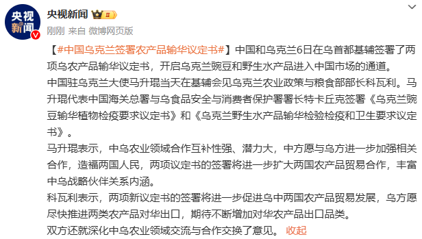 据央视新闻微博音书,中国和乌克兰6日在乌齐门基辅签署了两项乌农居品输华议定书,开启乌克兰豌豆和野生水居品插足中国市集的通说念。