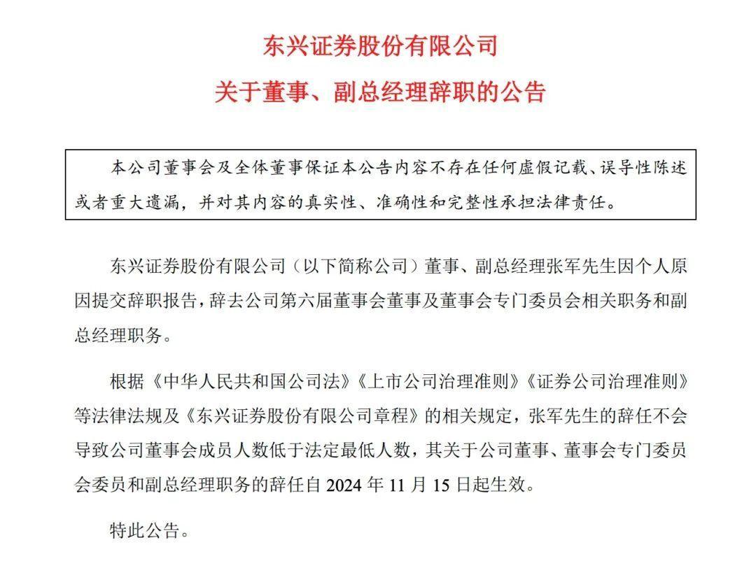 11月15日下昼,东兴证券发布公告称,董事、副总司理张军先生因个东谈主原因提交辞职陈说,辞去公司第六届董事会董事及董事会成心委员会关连职务和副总司理职务。