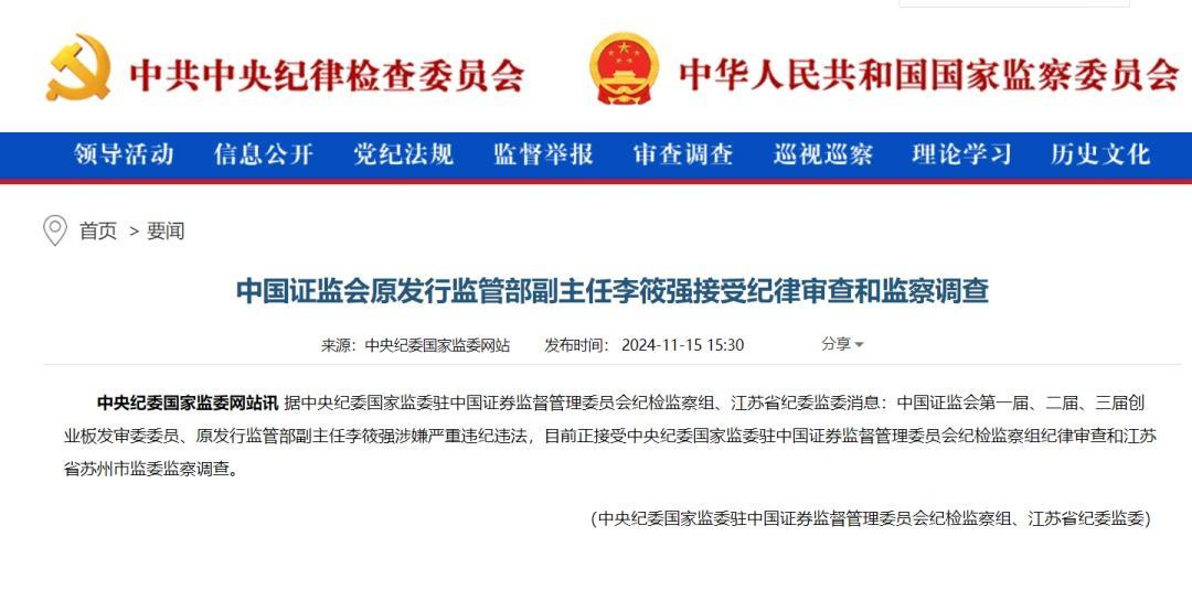 11月15日,据中央纪委国度监委驻中国证券监督贬责委员会纪检监察组、江苏省纪委监委音问:中国证监会第一届、二届、三届创业板发审委委员、原刊行监管部副主任李筱强涉嫌严重违法坐法,当今正给与中央纪委国度监委驻中国证券监督贬责委员会纪检监察组次序审查和江苏省苏州市监委监察访问。