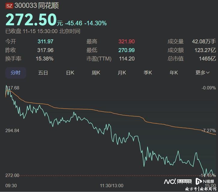 二级市集上,同花顺股价15日本日一起下行,适度收盘,报272.50点,市值缩水至不及1500亿元,跌幅达14.30%,这一跌幅在年内仅次于10月10日17.44%的跌幅。