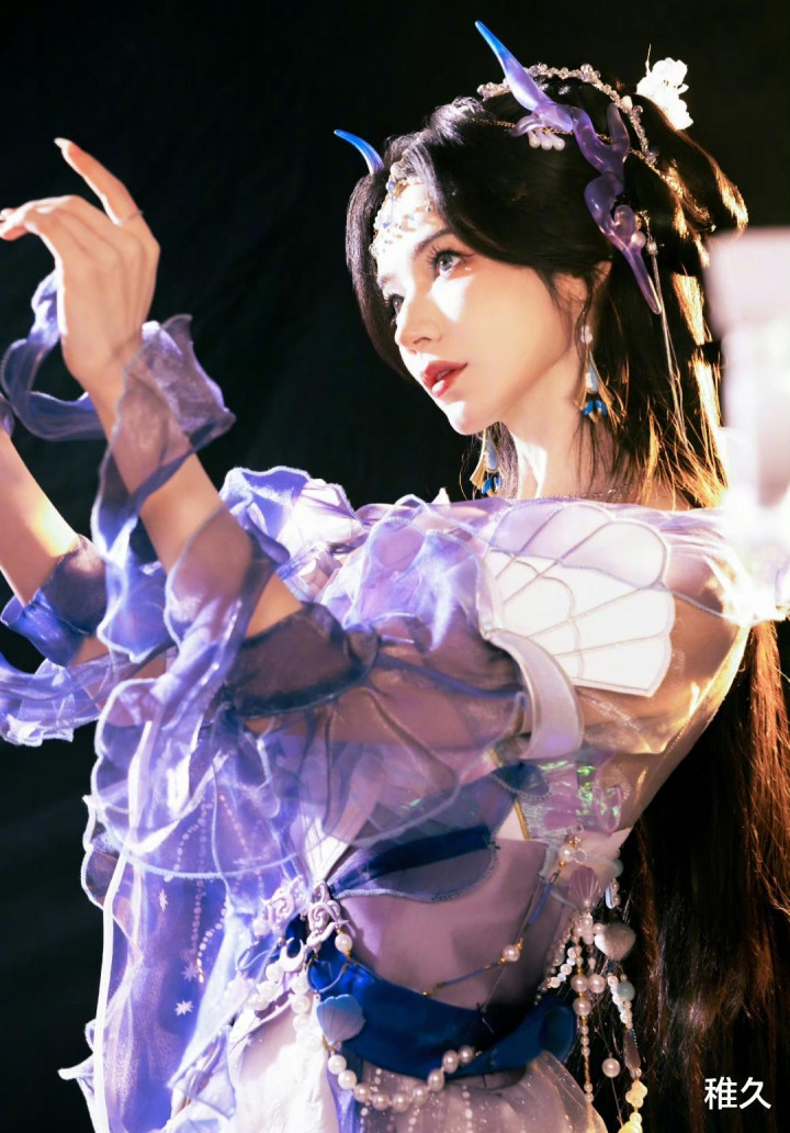 先说颜料。高富足的紫色极难独霸,稍有失慎便会流于艳俗。造型团队却骁勇采用薄如蝉翼的紫绡,外层覆以银丝暗纹,随作为转变,像月华在湖面碎成鳞光。腰封与护臂则是深到发乌的茄紫,压住轻纱的浮,让举座有了“夜泊秦淮”的千里郁底色。最惊艳的是头饰——并未走繁复金钗阶梯,仅以一枚紫晶伞骨发簪斜挽,几缕碎发垂落耳畔,恰似风过蓬莱,松涛入梦。