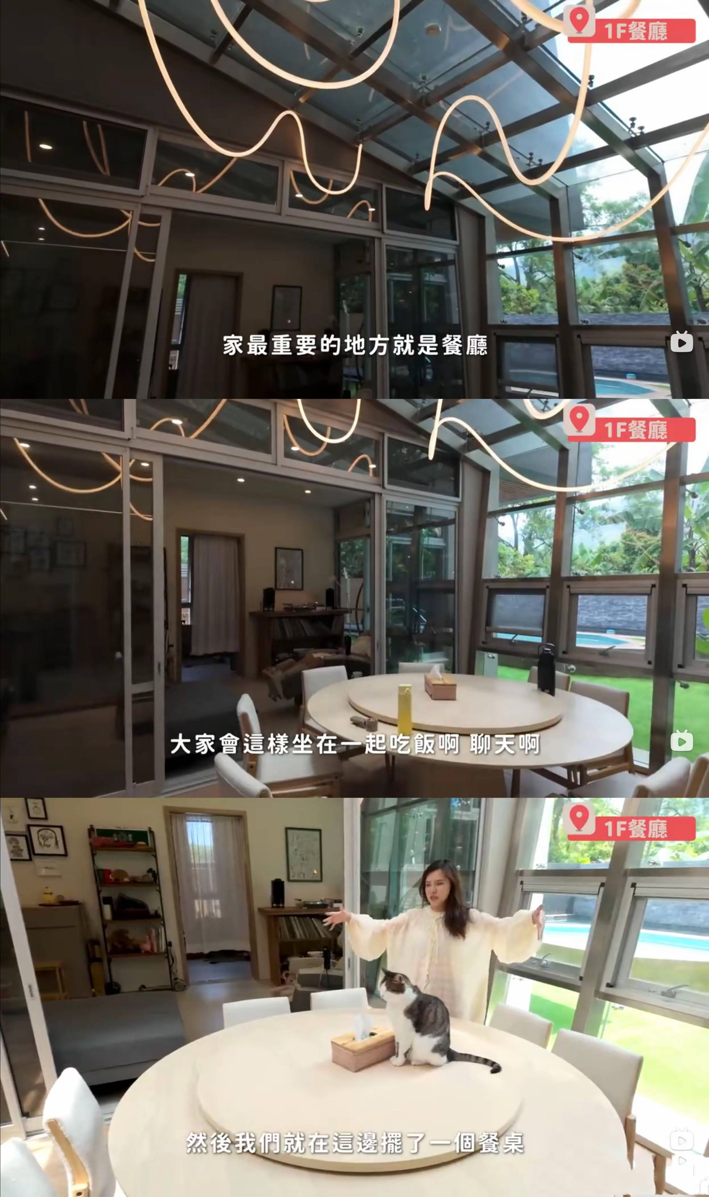 线条型的吊灯,也荒谬意旨。谢依霖家里的餐厅、越过多情调。中间放了大大的旋转餐桌,坐在这里吃饭就能看到院子外面的好意思景。
