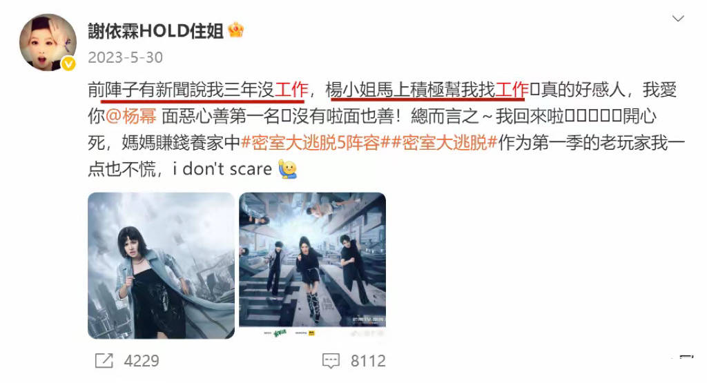 谢依霖是行运的,诚然有新闻说她3年都莫得职责。可杨幂知谈后,偶然给她安排了职责。于是谢依霖就运转成为收货养家的姆妈,也参与了录制《密室大脱逃》。