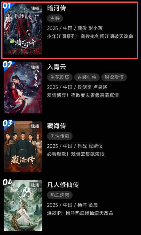 01奇幻武侠,冲破强烈,节律快《暗河传》答复了刺客组织“暗河”的大家长危在朝夕,苏暮雨(龚俊饰)当作直属大家长的蛛影团领袖“傀”卷入纷争,与好友拔剑相向的故事。