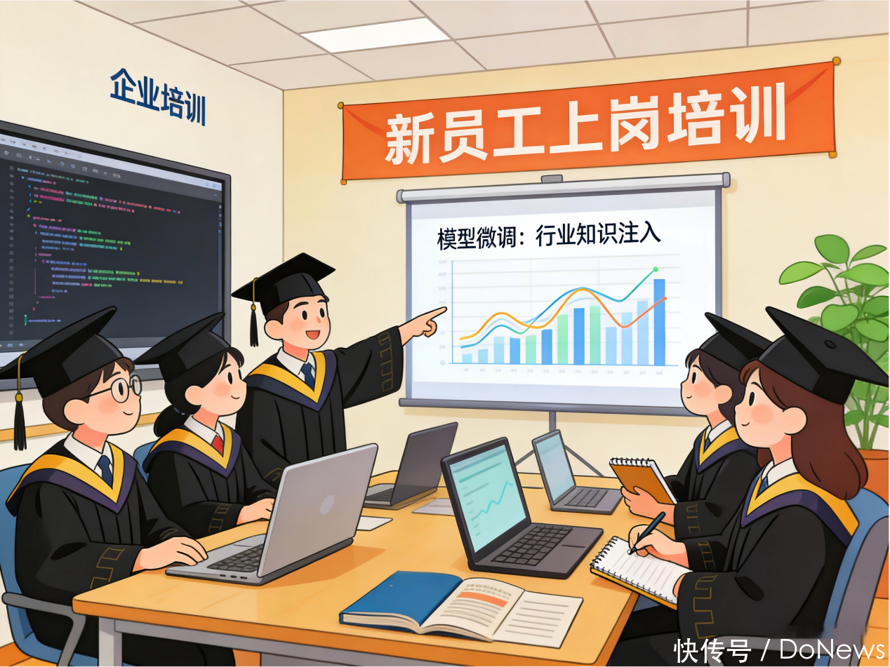 毕业后到企业责任,企业进行上岗培训,让你了解行业学问,这即是微调(Fine-tuning)。