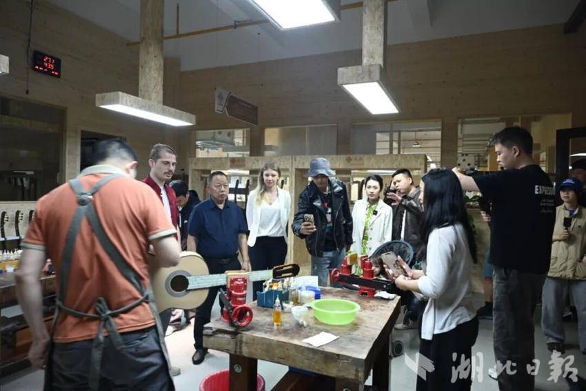上昼9点45分,后生博主们抵达市文化转换产业园。在不雅看城市宣传片后,寰球走进桐馨乐器工场,近距离不雅摩吉他制作的全历程,赏玩高端手工吉他,并与造琴民众深入一样,凝听每一把吉他背后的匠心故事。