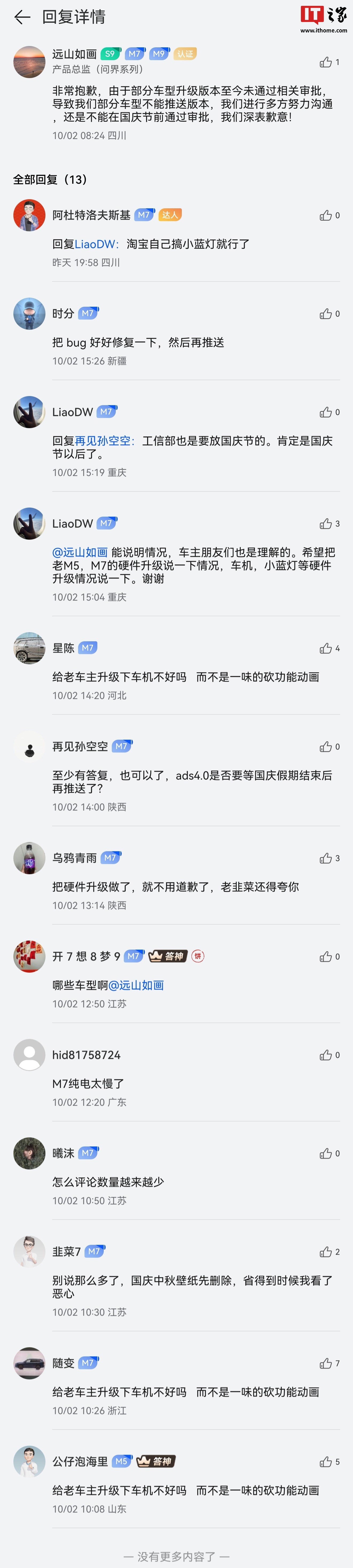 IT之家贯注到,问界系列居品总监 10 月 2 日在鸿蒙智行 App 发文致歉,称部分车型升级版块于今未通过关连审批,导致部分车型弗成推送版块,进行多方奋勉相易已经弗成在国庆节前通过审批(指摘区有 M7 车主用户称是 ADS 4 未推送)。