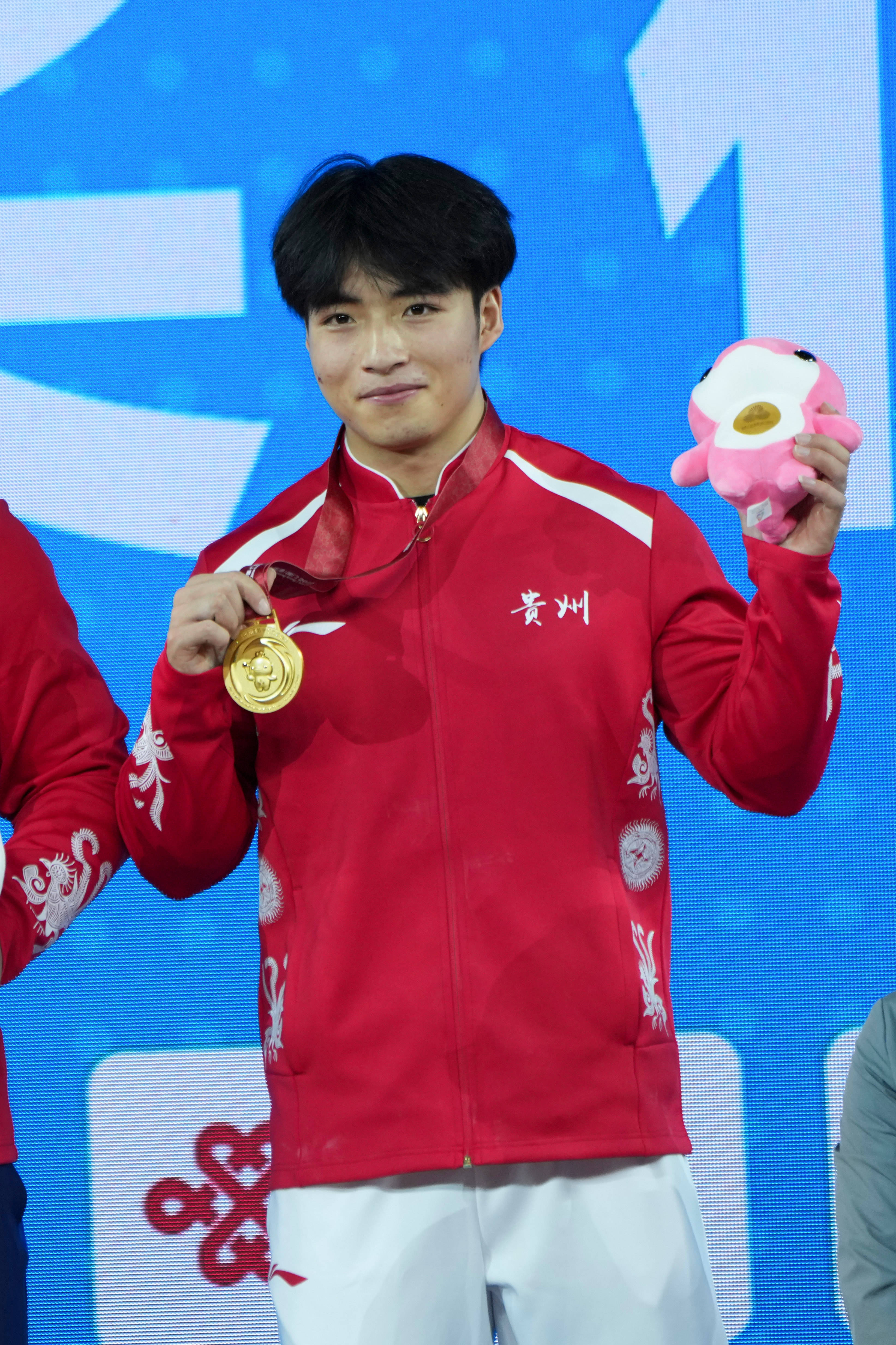 ↑11月18日,得到冠军的贵州队选手雷江清在受奖庆典上展示金牌,他身上的贵州代表队服装上绣着传统纹饰。新华社记者 杨曙光 摄在女子开脱体操赛场
