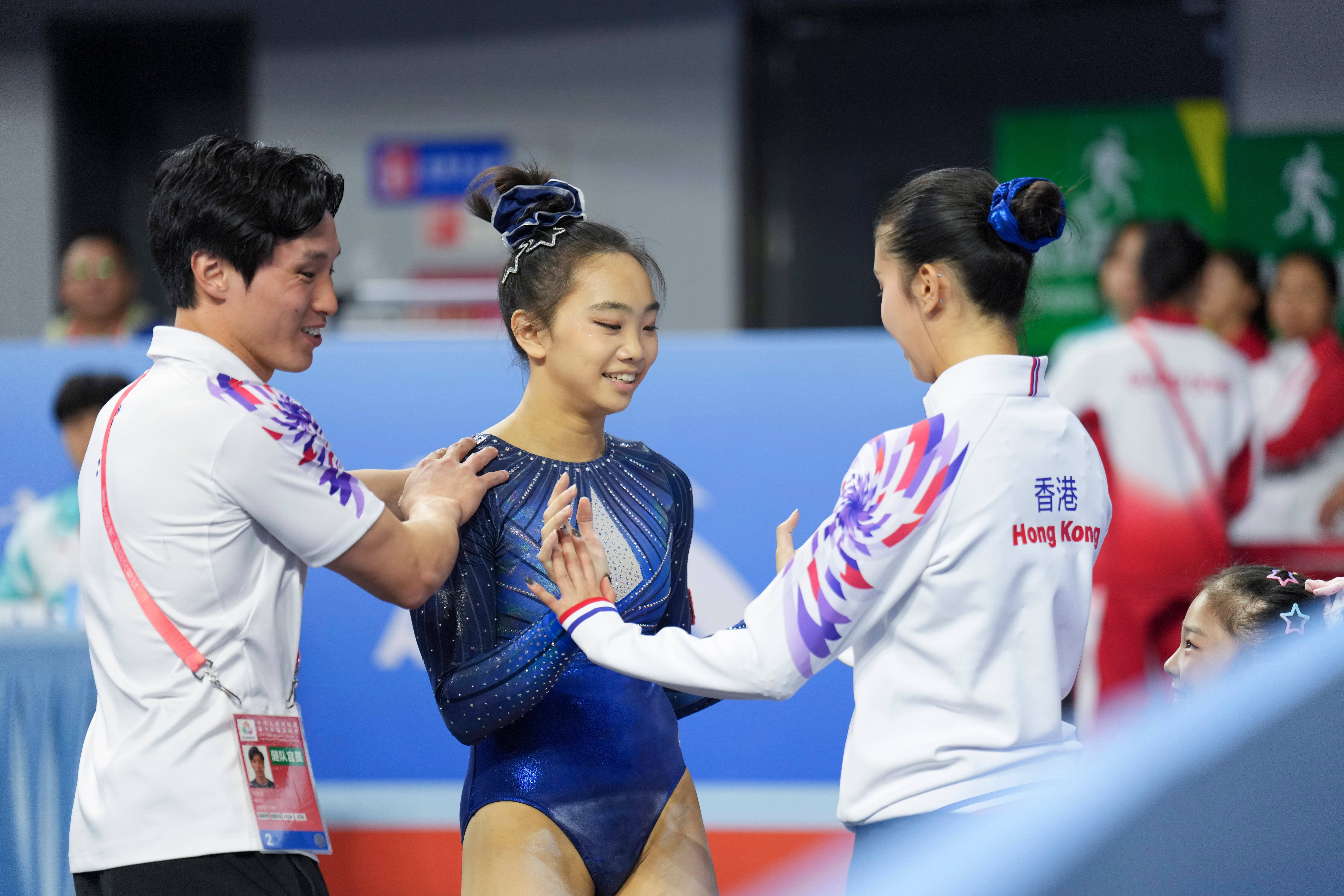 ↑11月11日,香港队选手曾凯缘(中)在均衡木比赛完赛后与汲引(左)、队友一齐庆祝。新华社记者 胥冰洁 摄“我自己是一个充满力量的通顺员
