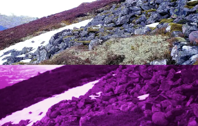 咱们东说念主类的晶状体会过滤掉紫外线这种短波后光,但在驼鹿这里,这些抵达视网膜的紫外线信号,会被那里特化的感光细胞拿获,从而在大脑中构建出一个奇怪的宇宙。咱们东说念主类看到的雪地是亮堂扎眼的白色,但驼鹿看到的雪地是一派暗千里的蓝灰颜色,这是因为雪会蛮横地反射紫外线,东说念主类直合计扎眼,但驼鹿却能无视紫外线的扎眼,凯旋看到雪地里的细节。