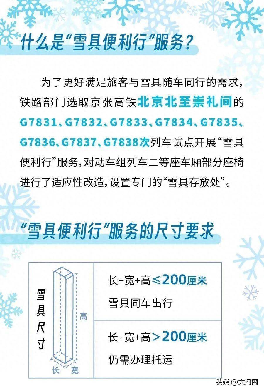 这次推出的“雪具便利行”管事,在京张高铁北京北至崇礼间的G7831、G7832、G7833、G7834、G7835、G7836、G7837、G7838次列车试点开展“雪具便利行”管事,对动车组列车二等座车厢部分座椅进行了适合性鼎新,竖立成心的“雪具存放处”,游客聘用该管事后可佩带长、宽、高之和不跳跃200厘米的雪具同车出行,滑雪愈加简短快捷。关于长、宽、高之和跳跃200厘米的雪具,仍需办理托运。